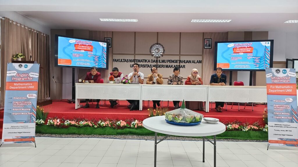 Makassar — Jurusan Matematika Fakultas Matematika dan Ilmu Pengetahuan Alam (FMIPA) Universitas Negeri Makassar (UNM) melaksanakan kegiatan Soft Launching English Program pada Rabu, 29 Januari 2026. Kegiatan ini menjadi langkah strategis jurusan dalam mendukung International Class Program (ICP) guna meningkatkan kualitas dosen dan mahasiswa.